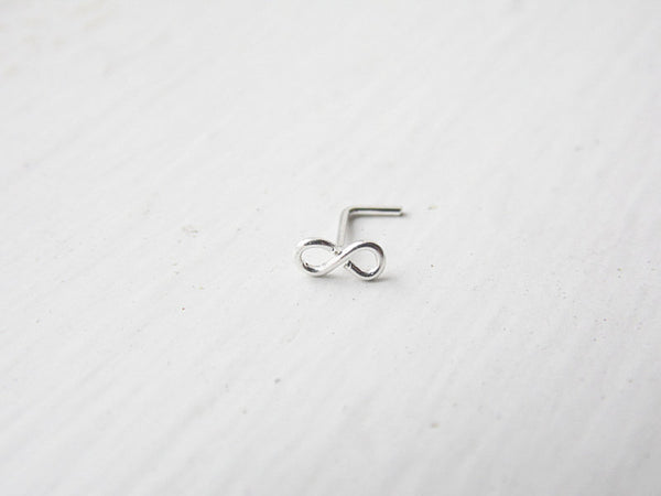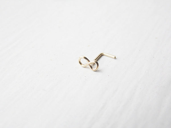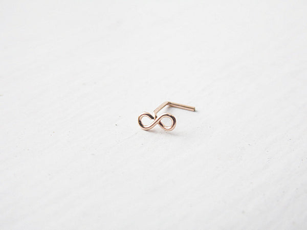 This listing is for ONE tiny infinity nose screw in sterling silver, yellow gold fill or rose gold fill. This nose screw is 22 gauge and can be made in screw or L shaped back.