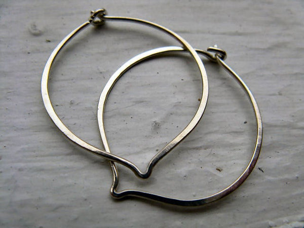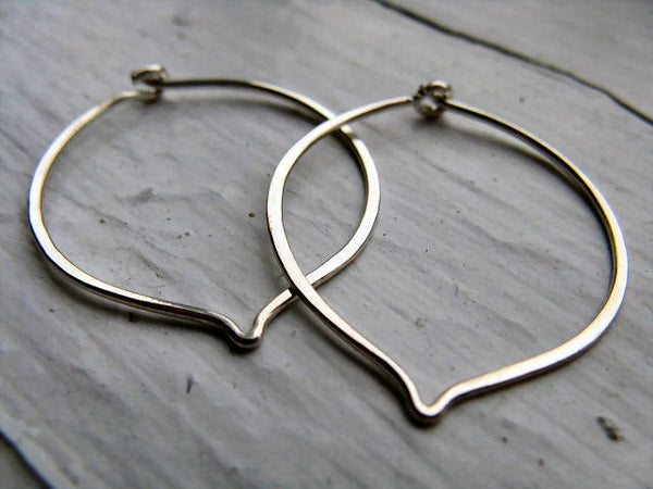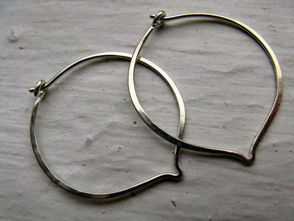 Sterling silver has been cold forged into lotus petal, leaf shaped hoops. Simple and lightweight, these hoops will accent any outfit and are great for everyday wear. They have been hammered slightly for depth and texture.