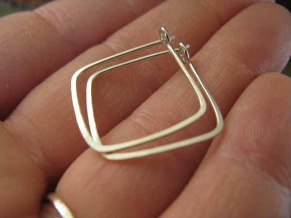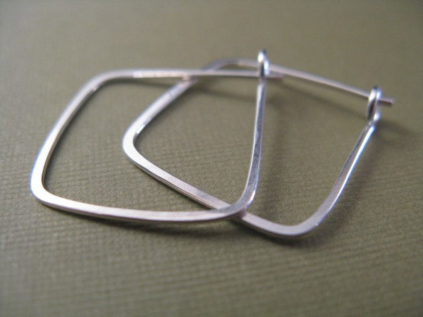 Standard earring wire (20 gauge) in sterling silver has been cold forged into these cute square hoop earrings. The have been hammered for texture and polished to a bright shine.